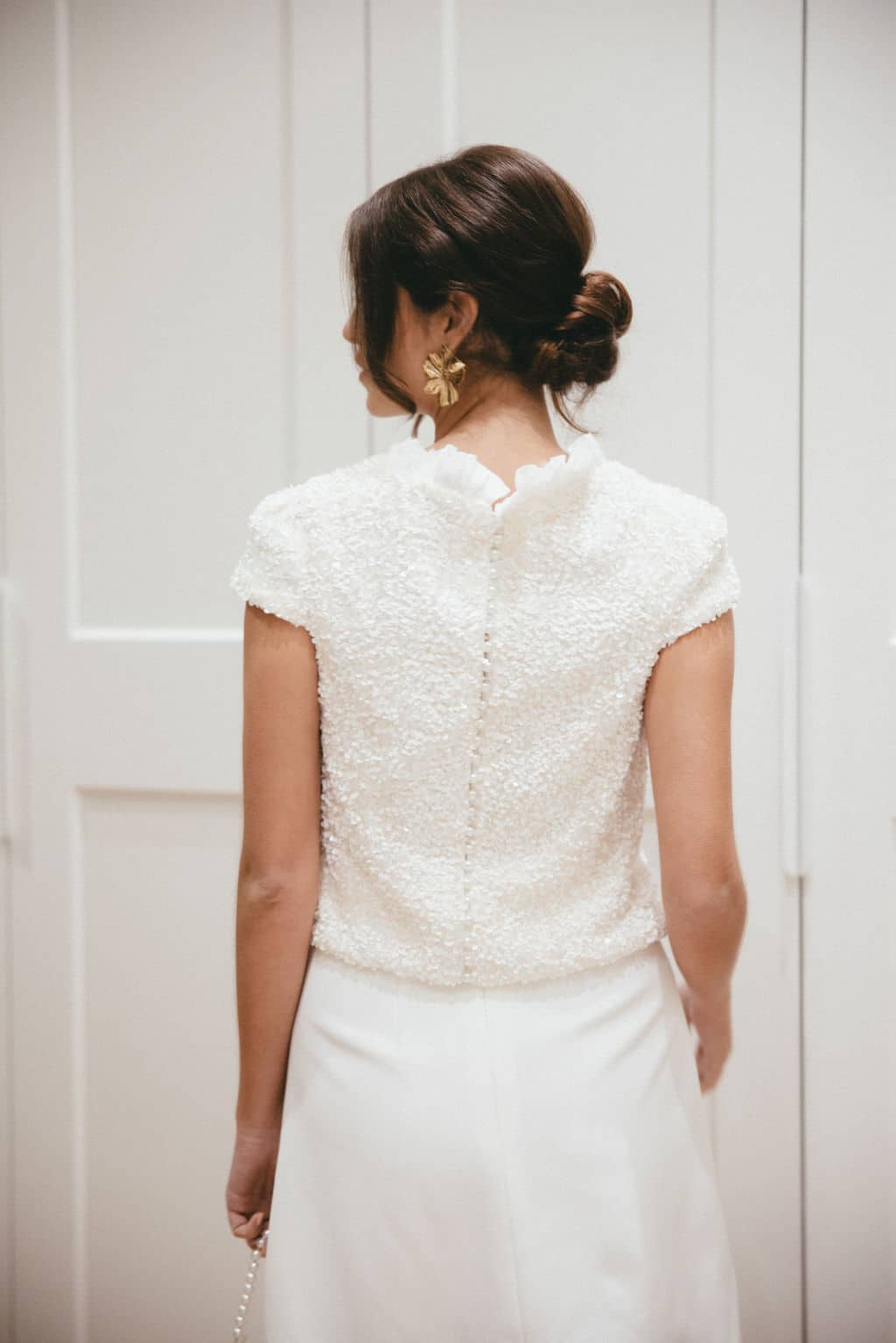 Opter pour cette blouse en sequins blancs/ nacrés pour un look frais et moderne ! Son joli col montant en crêpe donne une allure moderne au top.