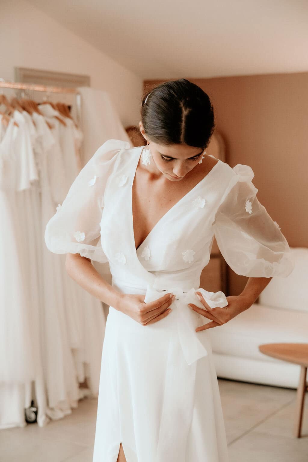 Craquez pour notre blouse PIA, son décolleté cache-coeur et ses manches trois quarts ballons en organza.