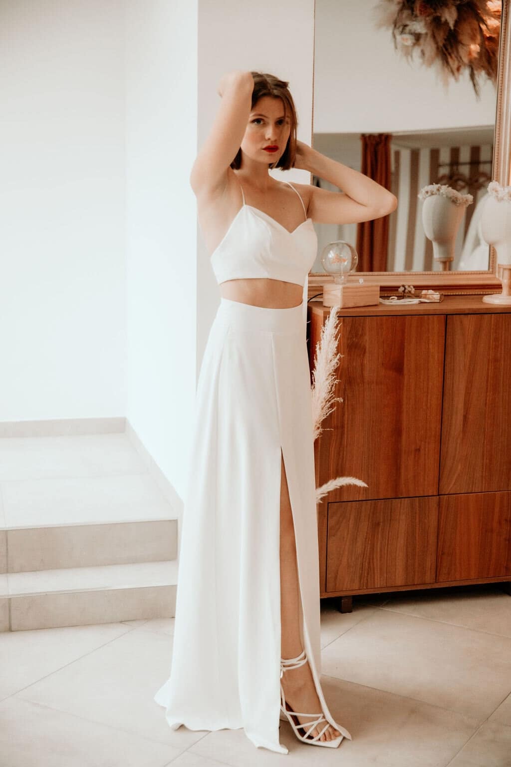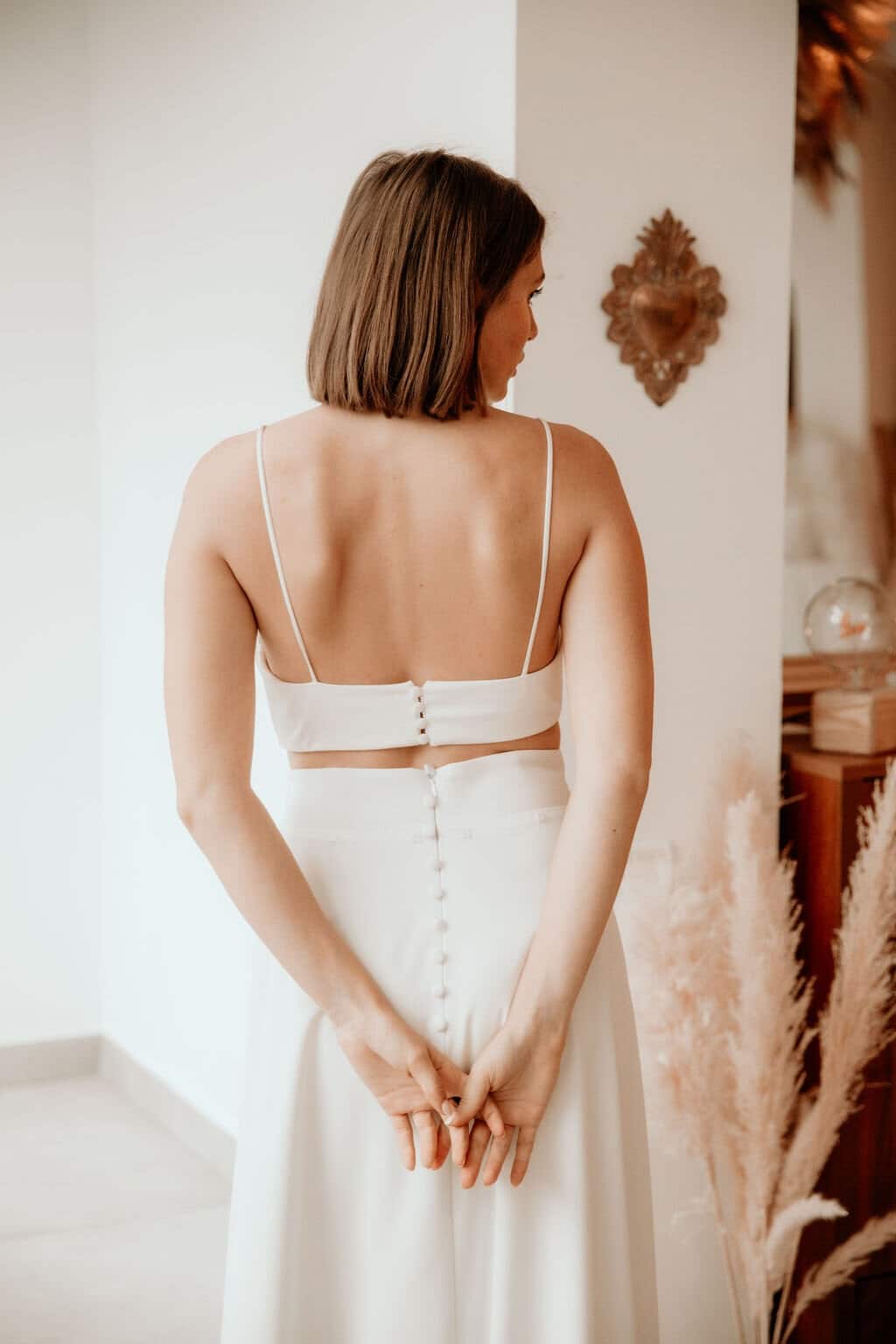 Moderne avec ses fines bretelles et son dos boutonné en perles nacrées.