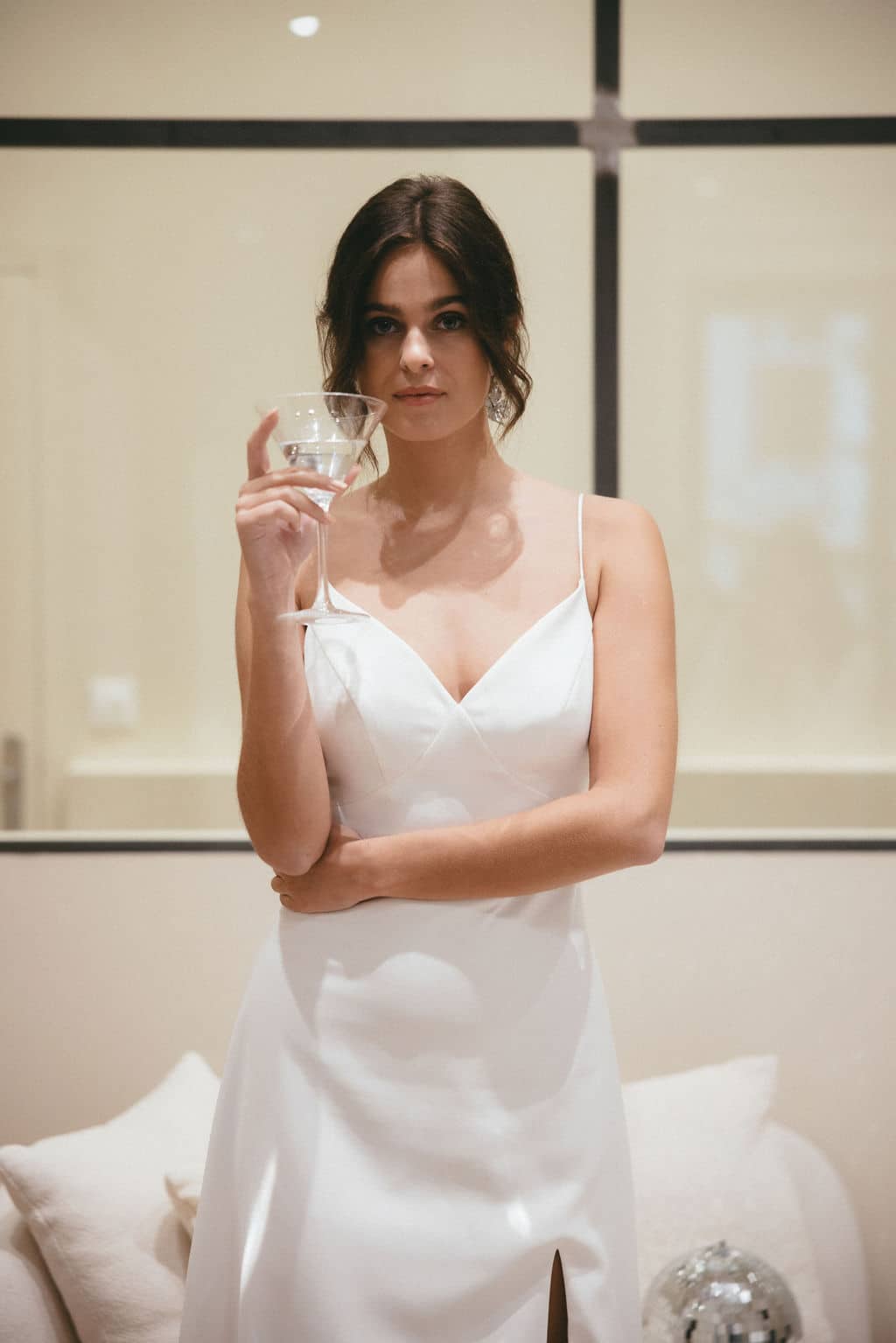 Sans dentelle, et conçue dans un crêpe légèrement satiné, Octavia est idéale pour les futures mariées en quête d’élégance et de sobriété.