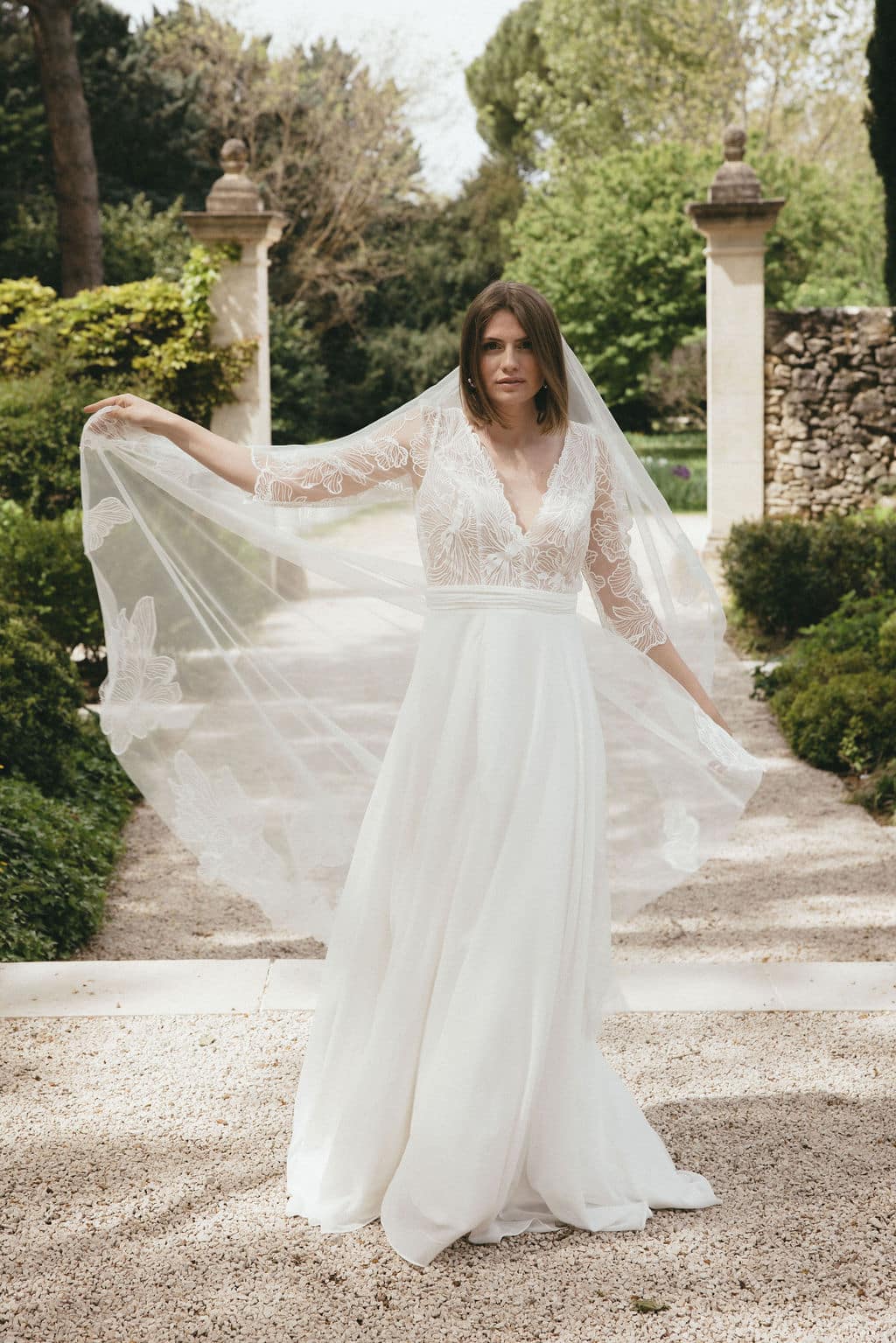 Voile Lili sur tulle blanc ou en plumetis et fleurs brodées sur les contours du voile.
